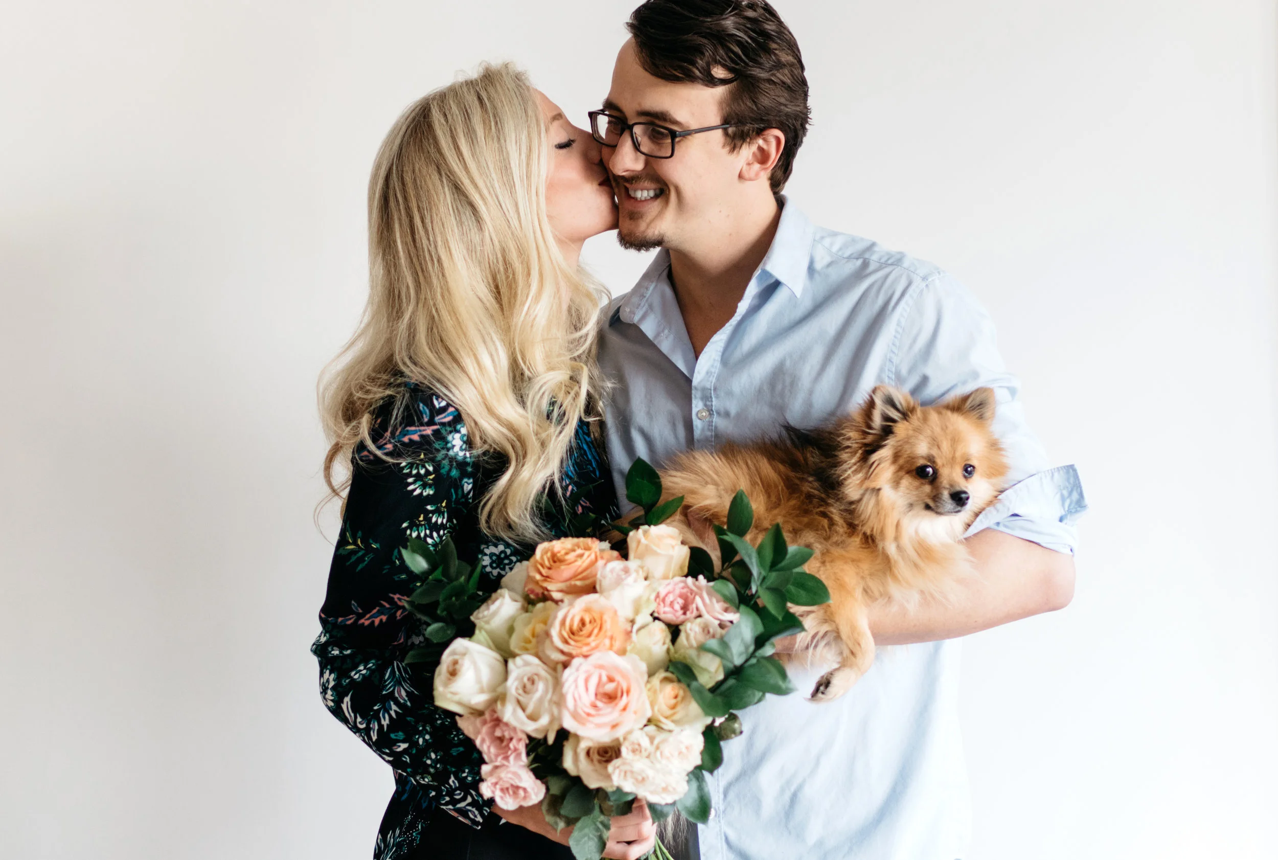 I wanted to share a few of my favorite photos from a recent photoshoot we worked on for UrbanStems because it's the month of love and I love these two. Bryan is always so willing to take photos with me, which makes me the happiest person alive. Also, Bjorn has learned that if he sits and poses, delicious treats are in his future. So yeah, they're the best.